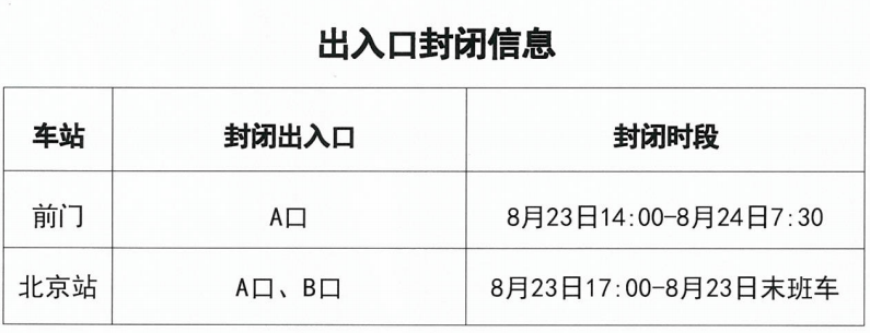 根据北京市公安局公安交通管理局《关于对部分道路采取临时交通管理措施的通告》,为保障专项活动安全顺利,2025年8月23日14时起至8月24日7时30分,地铁1号线八通线、2号线、4号线、5号线、6号线、8号线、10号线、14号线、19号线、昌平线部分车站采取出入口封闭、车站封闭措施,相关换乘站停止换乘。
