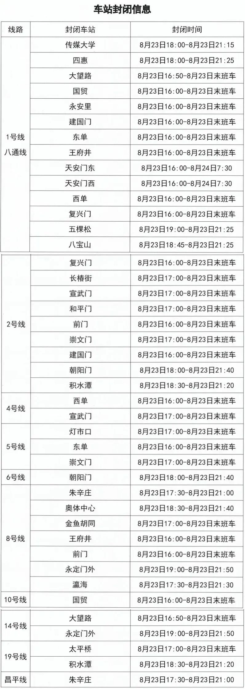 根据北京市公安局公安交通管理局《关于对部分道路采取临时交通管理措施的通告》,为保障专项活动安全顺利,2025年8月23日14时起至8月24日7时30分,地铁1号线八通线、2号线、4号线、5号线、6号线、8号线、10号线、14号线、19号线、昌平线部分车站采取出入口封闭、车站封闭措施,相关换乘站停止换乘。